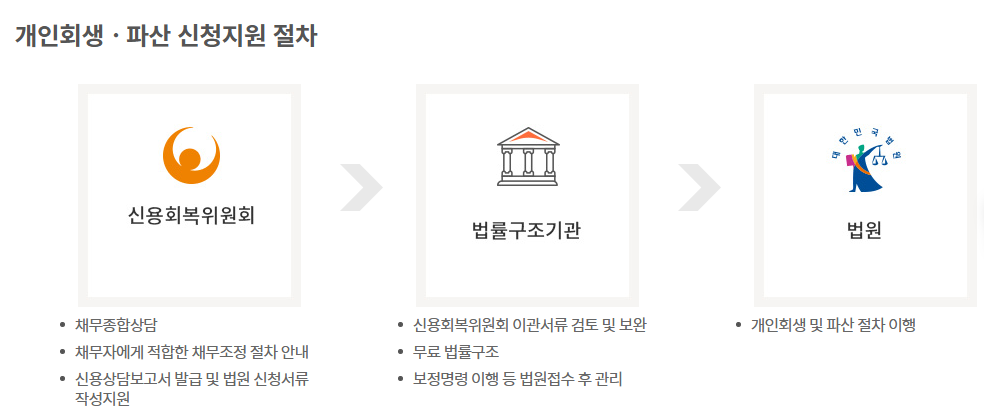 신용회복위원회는 개인회생 및 파산 신청 관련 상담과 서류 작성을 무료로 지원합니다. 법률구조공단 및 법원과 연계하여 One-stop 서비스를 제공합니다.