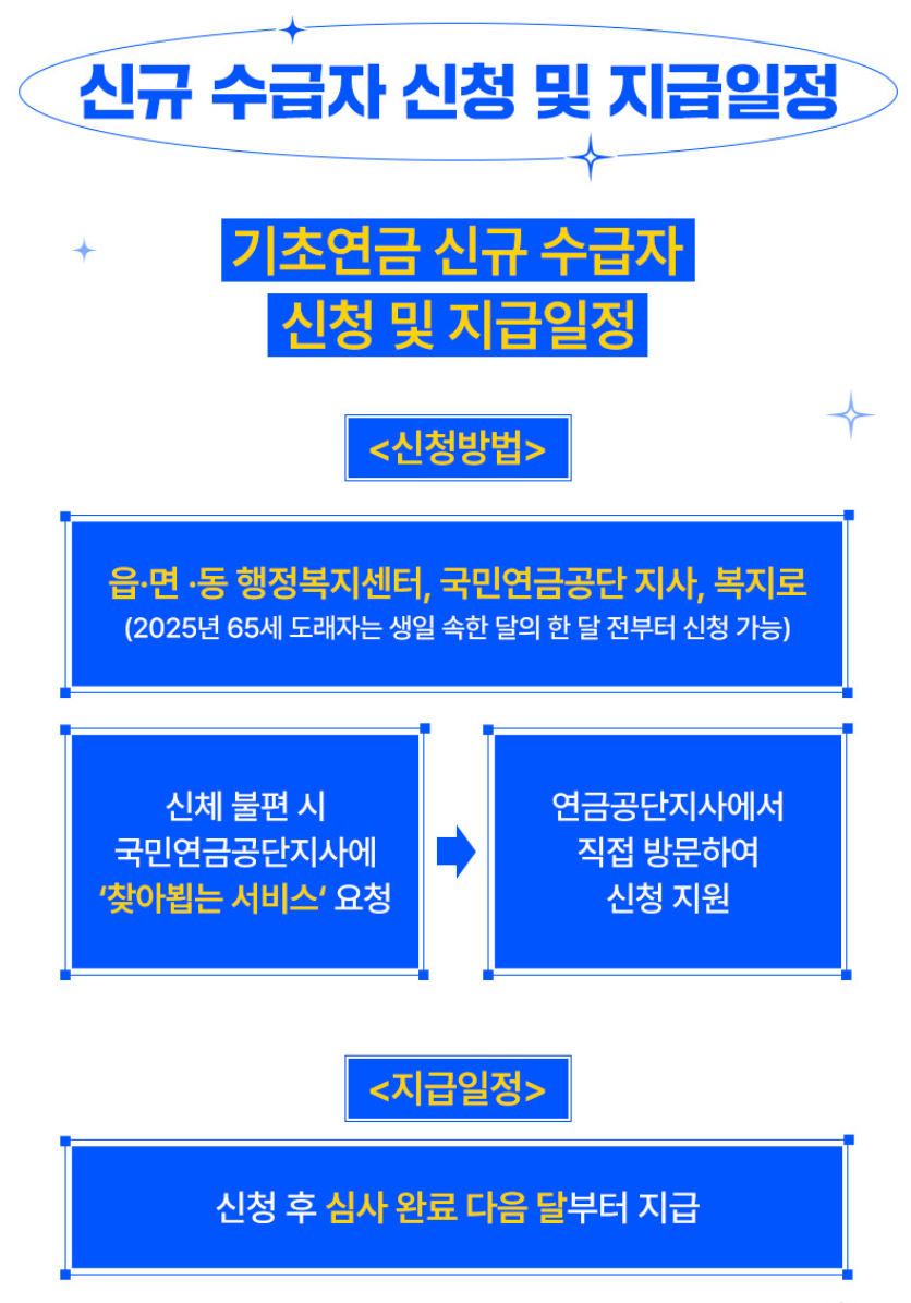 2025년부터 1960년생이 기초연금 신청 대상에 포함됩니다. 신청은 만 65세 생일이 포함된 달의 전 달 1일부터 가능합니다.
