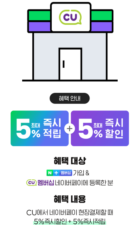 - QR 결제 시 5% 할인 + 5% 적립 (CU멤버십 필요)