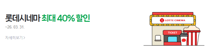 - 롯데시네마: 일반관 2D 영화 최대 40% 할인 (월 4회, 2026년 3월까지)