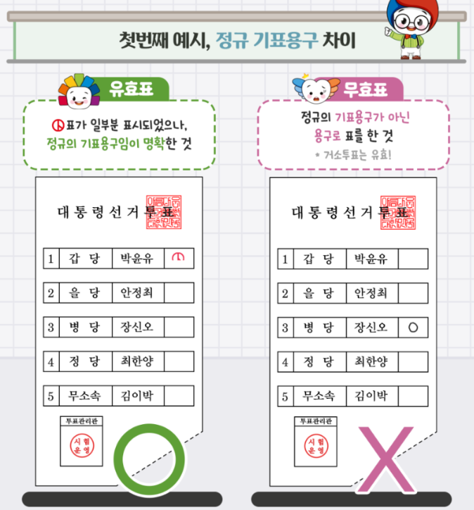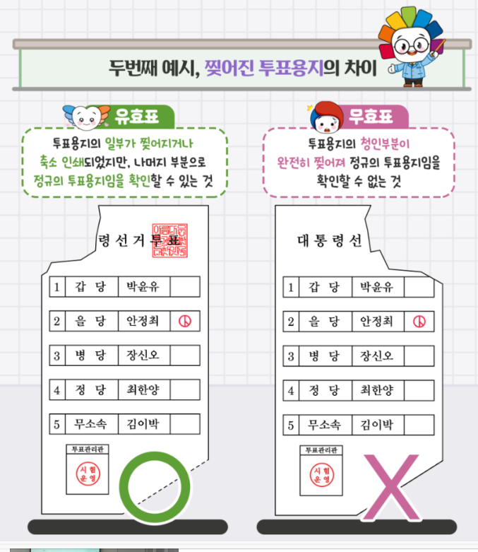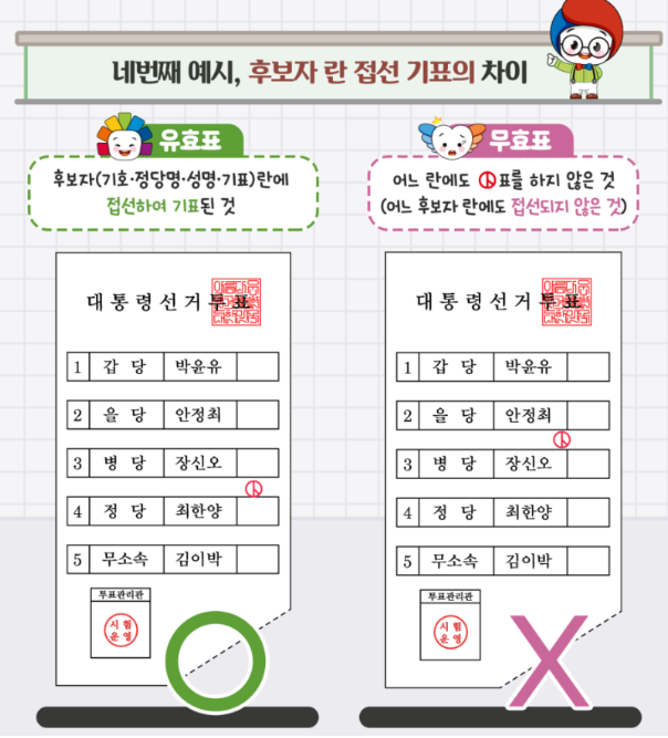 - 두 후보 중간에 찍힌 경우 등 누구를 선택했는지 모호하면 무효.