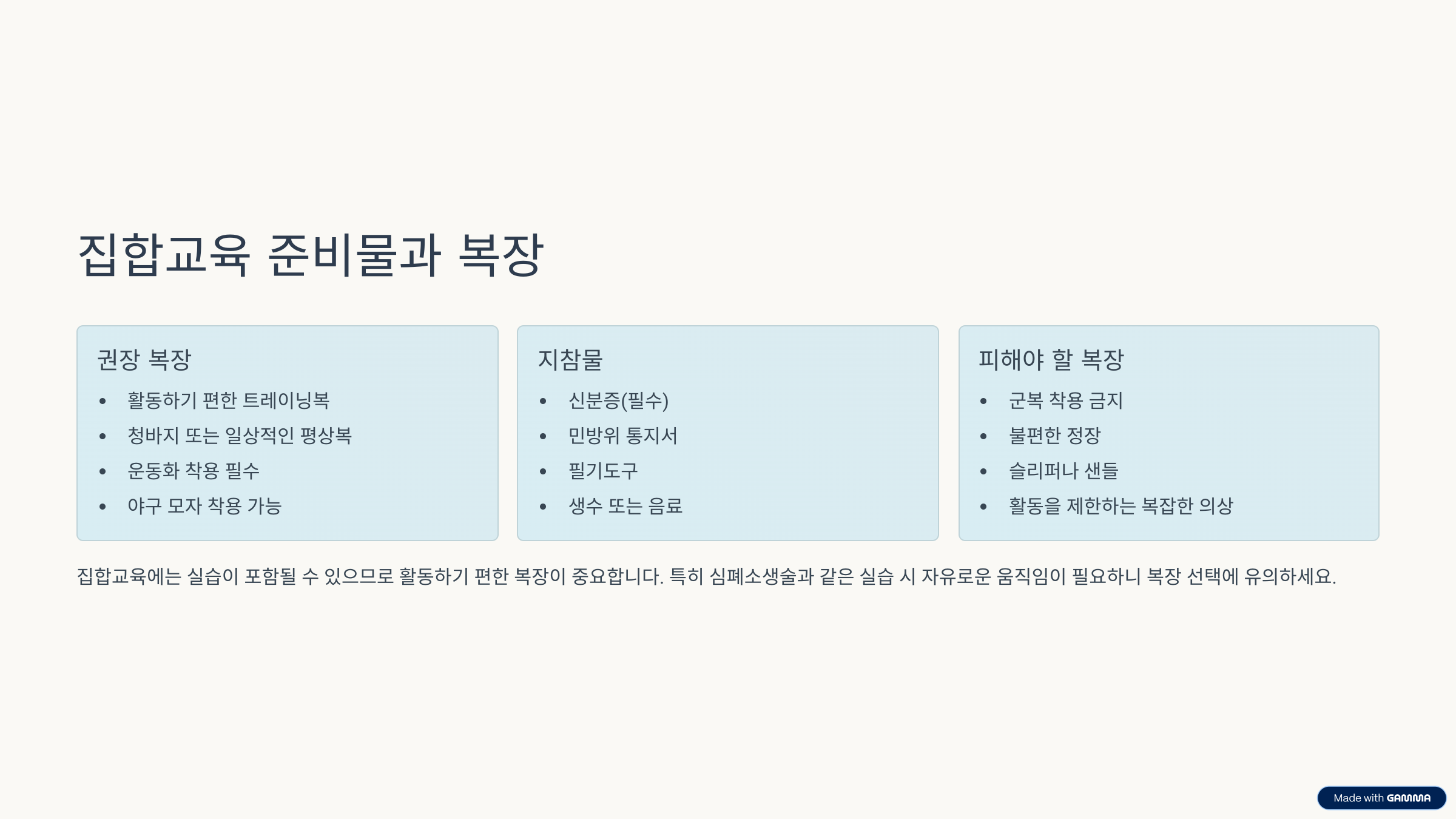 실습이 포함된 경우가 있어 활동하기 편한 복장이 좋습니다. 트레이닝복, 청바지, 평상복이 권장되며 운동화 착용이 필수입니다. 야구 모자는 가능하지만, 군복이나 복잡한 복장은 추천되지 않습니다.