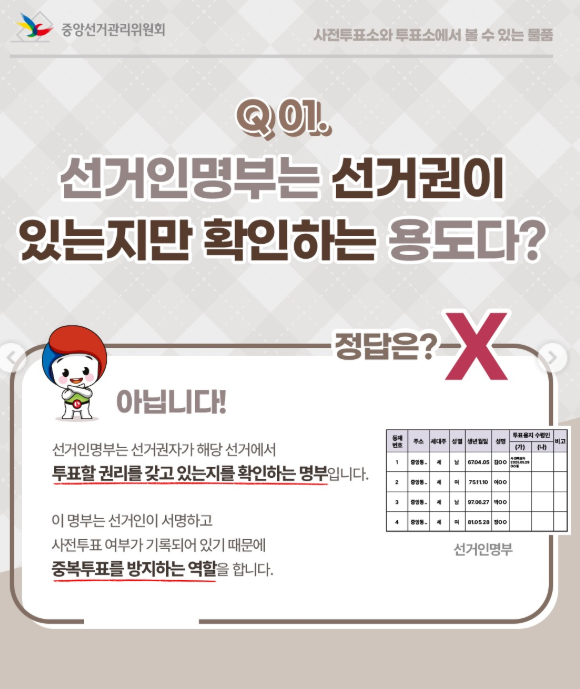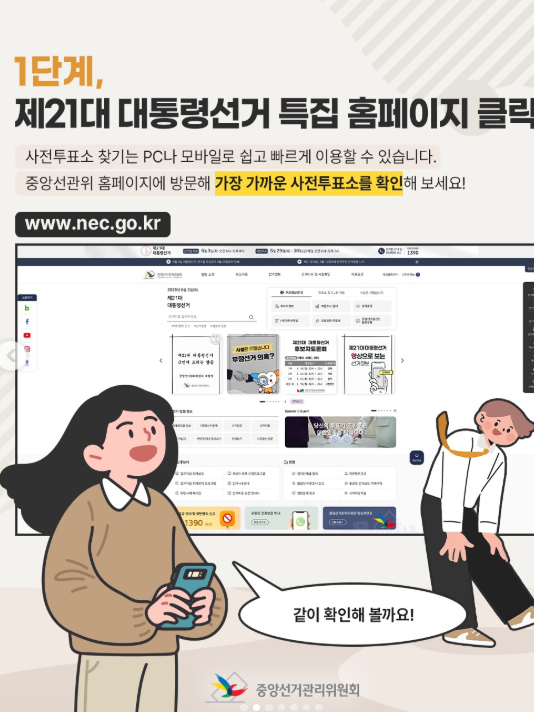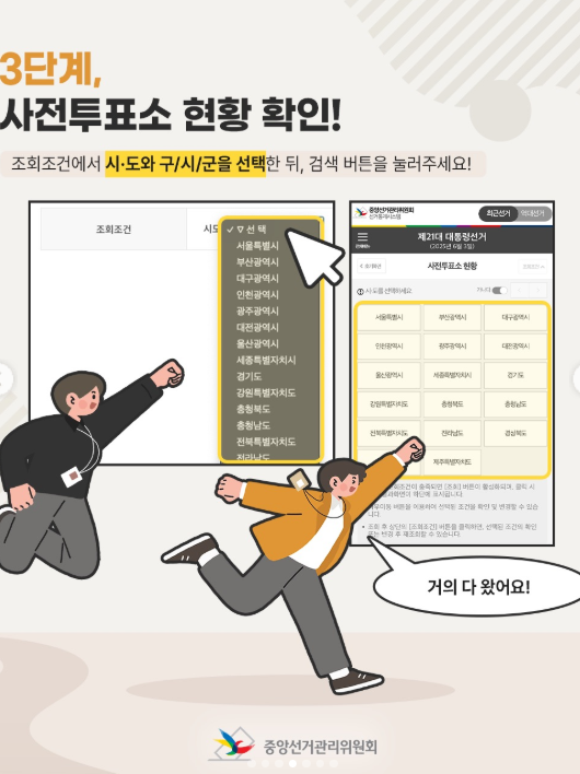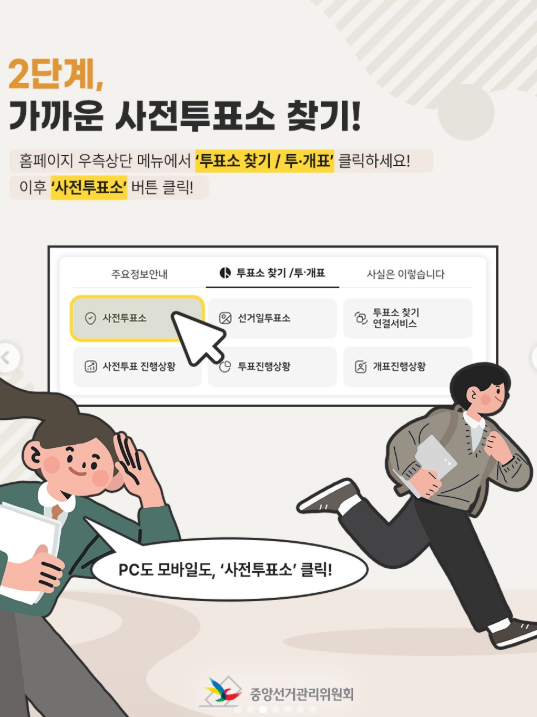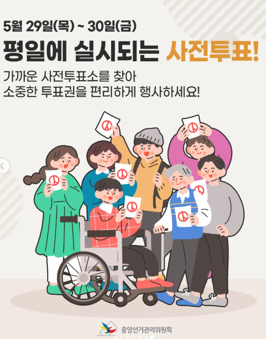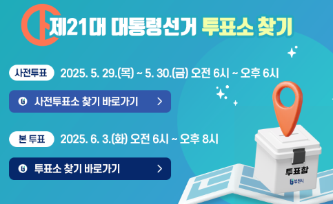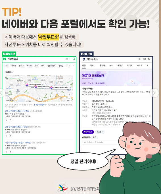 - 중앙선관위 홈페이지 https://si.nec.go.kr/ 또는 ‘선거정보’ 앱을 통해 가까운 사전투표소를 확인하세요.