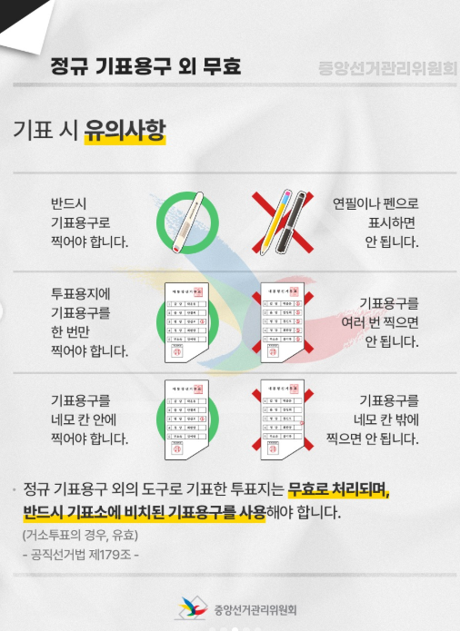 - 기표소에서 정당 또는 후보자란에 도장을 찍습니다.