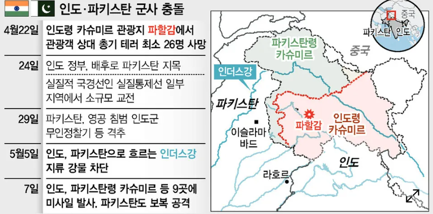 - 7일: 인도 ‘신두르 작전’ 개시 → 파키스탄 9곳 미사일 공격