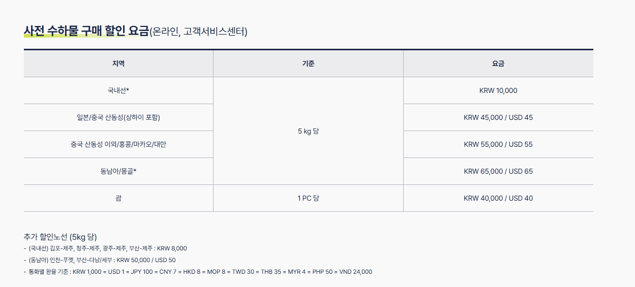 | 추가 요금 | 국내선 5kg당 10,000원 / 국제선 45,000~55,000원 |