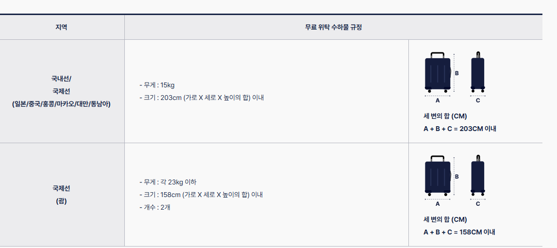 | 국제선 위탁 수하물 | 노선별 20~23kg 무료 |