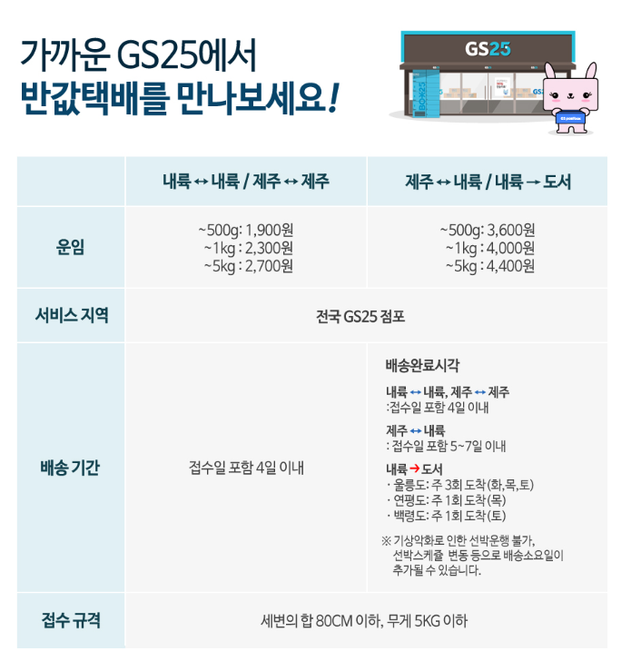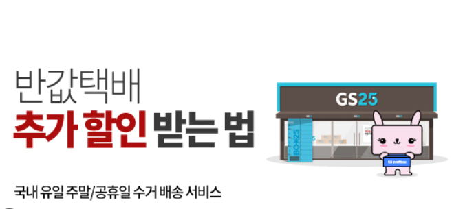 GS25에서 운영하는 택배 서비스로 CJ대한통운과 제휴된 일반택배, 그리고 편의점 간 이동 서비스인 반값택배 두 가지가 있습니다.